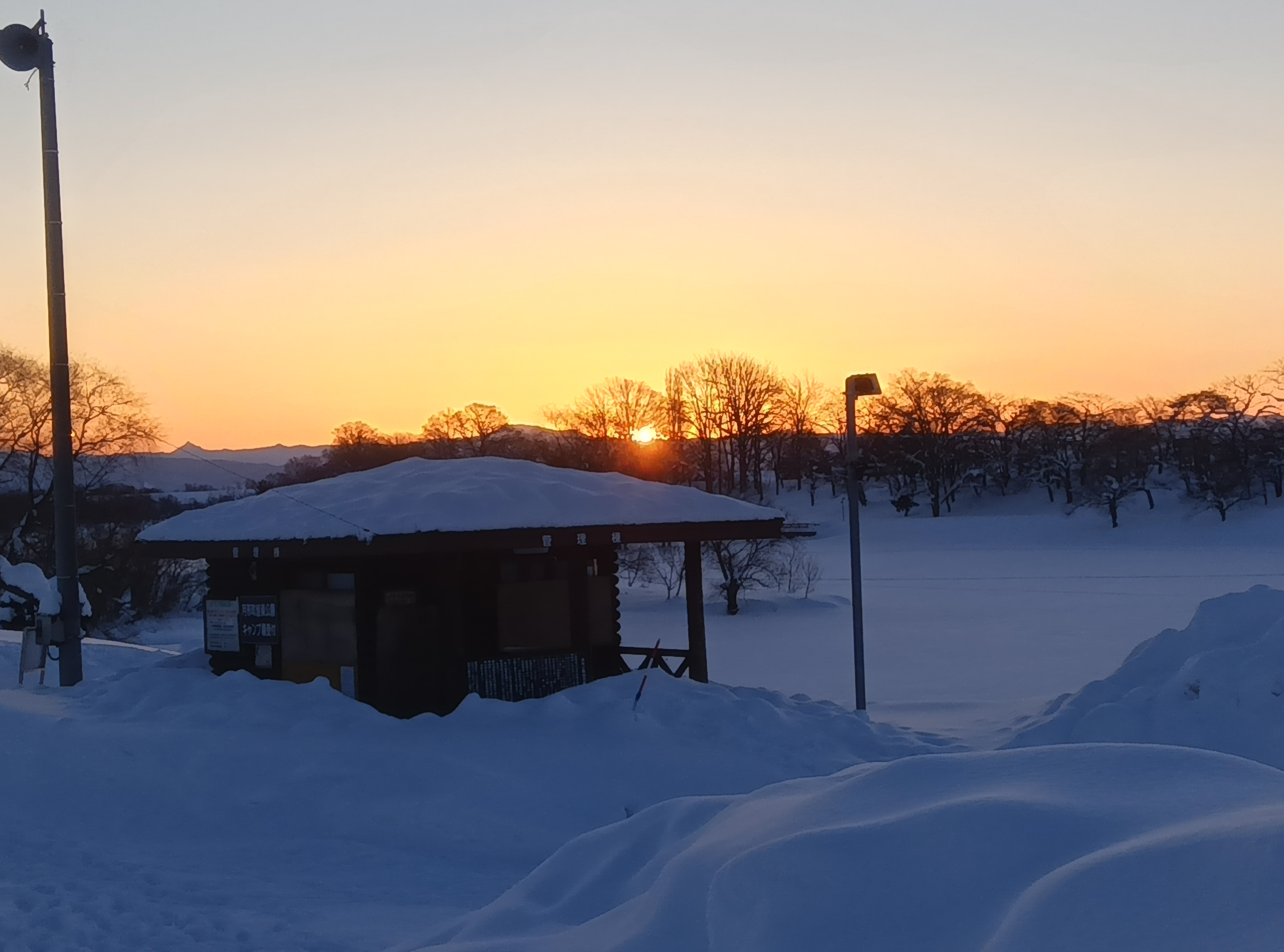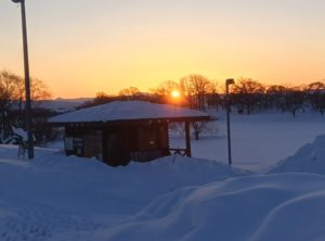 多少風が強いですが、快晴です。当施設向かいの公園より、初日の出が見えました。