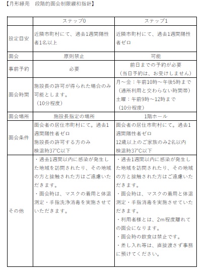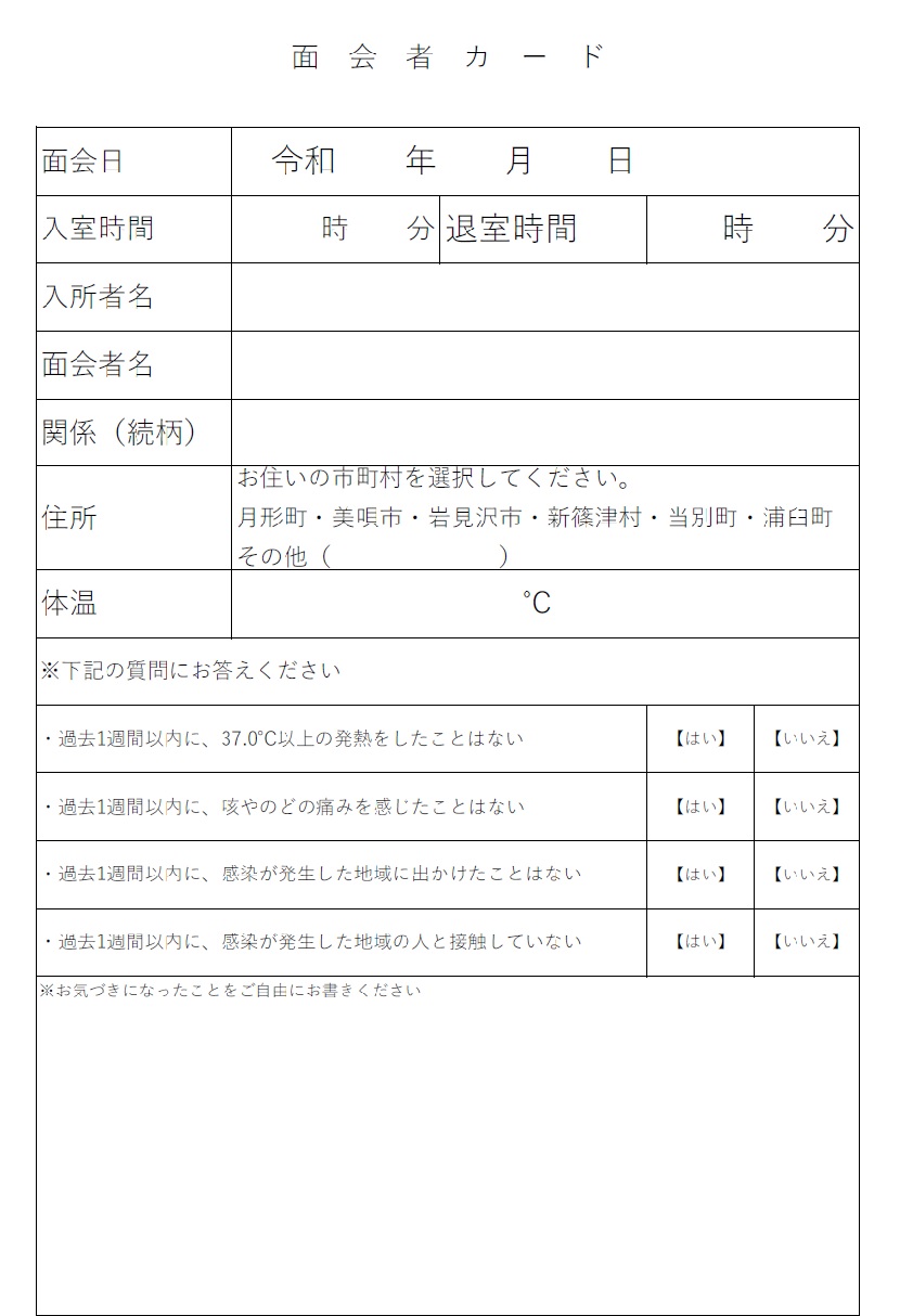 面会についてarticle 2020.06.12 面会制限を緩和することになりましたので、皆様にご連絡いたします。 ご家族様へ案内文 段階的面会制限緩和指針 面会カード <<前の記事 一覧へ戻る 次の記事>>