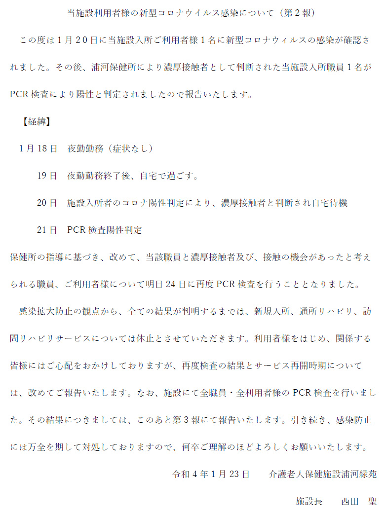当施設利用者様の新型コロナウィルス感染について(第2報)