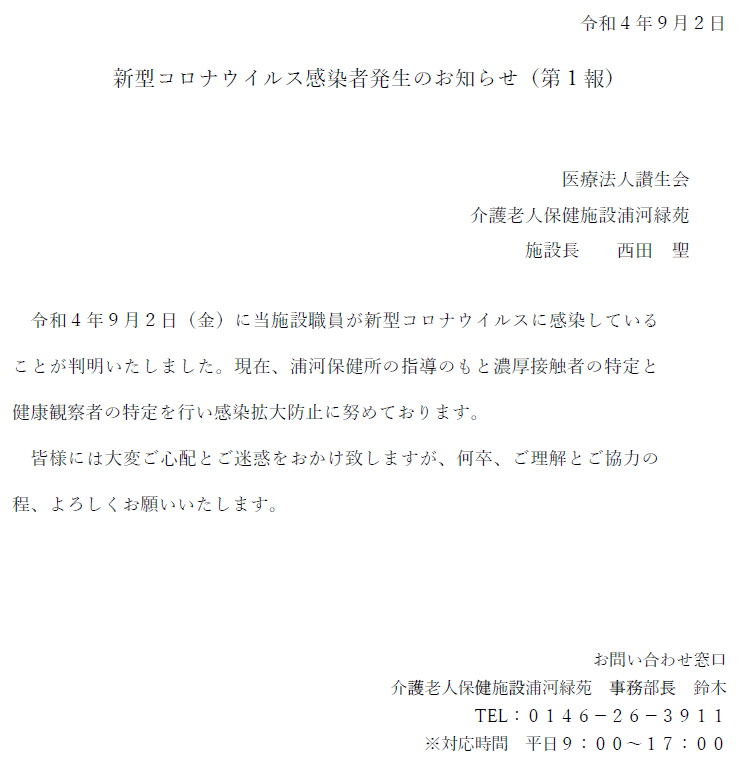 新型コロナウィルス感染者発生のお知らせ(第1報)
