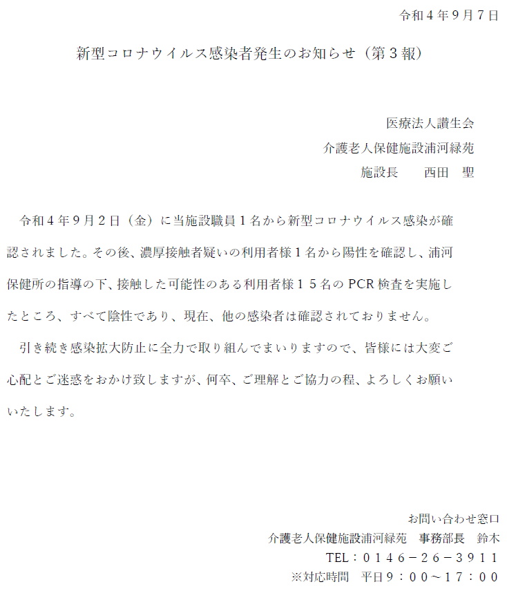 新型コロナウイルス感染者発生のお知らせ(第3報)