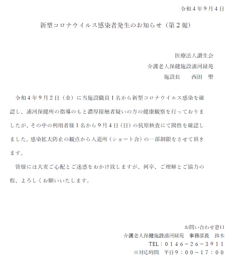 新型コロナウイルス感染者発生のお知らせ(第 2 報)